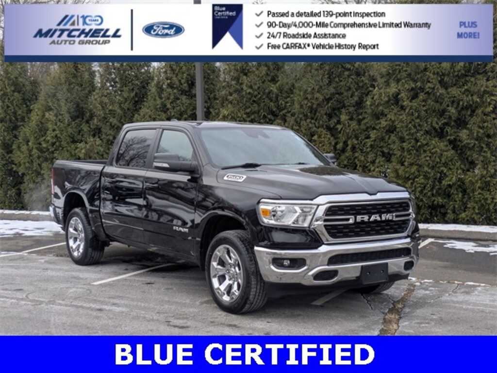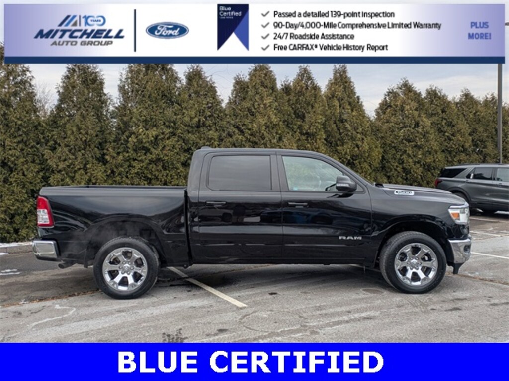 Blue Certified Certified, ** - BLUE CERTIFIED PRE-OWNED RAM 1500 BIG HORN !!! --- PART OF THE FORD BLUE ADVANTAGE PROGRAM!! - LOCATED AT MITCHELL SELIG FORD IN WINDSOR, CT AT 801 BLOOMFIELD AVE --- RIGHT OFF EXIT 37 VIA ROUTE 91 !!! -- CONTACT US TODAY AT 860-688-3651 OR ONLINE AT MitchellSeligFord.com !!!, **** --- BRAND NEW SET OF ALL 4 TIRES !!!, 2nd Row In Floor Storage Bins, 48V Belt Starter Generator, 4G LTE Wi-Fi Hot Spot, 8.4" Touchscreen Display, Advanced Brake Assist, Air Conditioning ATC w/Dual Zone Control, All R1 High Radios, All Radio Equipped Vehicles, Alloy wheels, Apple CarPlay, Auto-Dimming Exterior Driver Mirror, Auto-Dimming Rear-View Mirror, Bed Utility Group, Big Horn Badge, Big Horn Level 1 Equipment Group, Black Exterior Mirrors, Black Premium Power Mirrors, Bluetooth Handsfree Phone & Audio, Class IV Receiver Hitch, Cloth Bench Seat, Cluster 3.5" TFT Color Display, Connected Travel & Traffic Services, Connectivity - US/Canada, Convex Wide-Angle Mirror Insert, Disassociated Touchscreen Display, Exterior Mirrors Courtesy Lamps, Exterior Mirrors w/Heating Element, Exterior Mirrors w/Supplemental Signals, For Details, Visit DriveUconnect.com, Full Speed Forward Collision Warning Plus, Global Telematics Box Module (TBM), Glove Box Lamp, Google Android Auto, GPS Antenna Input, GPS Navigation, HD Radio, Integrated Center Stack Radio, Integrated Voice Command w/Bluetooth, Lane Keep Assist, Level 1 Safety Group, MOPAR 4 Adjustable Cargo Tie-Down Hooks, MOPAR Deployable Bed Step, MOPAR Spray In Bedliner, ParkView Rear Back-Up Camera, Pedestrian Emergency Braking, Pick-Up Box Lighting, Power 2-Way Driver Lumbar Adjust, Power 8-Way Driver Seat, Power Adjustable Pedals, Power door mirrors, Power windows, Power-Folding Mirrors, Quick Order Package 23Z Big Horn, Radio: Uconnect 5 Nav w/8.4" Display, Radio: Uconnect 5 W w/8.4" Display, Rear Dome w/On/Off Switch Lamp, Rear Power Sliding Window, Rear Window Defroster, Remote Start System, SiriusXM Radio Service, SiriusXM Satellite Radio, SiriusXM w/360L, Sun Visors w/Illuminated Vanity Mirrors, Universal Garage Door Opener, USB Host Flip, Wheels: 20" x 9" Aluminum Chrome Clad (WRK).
