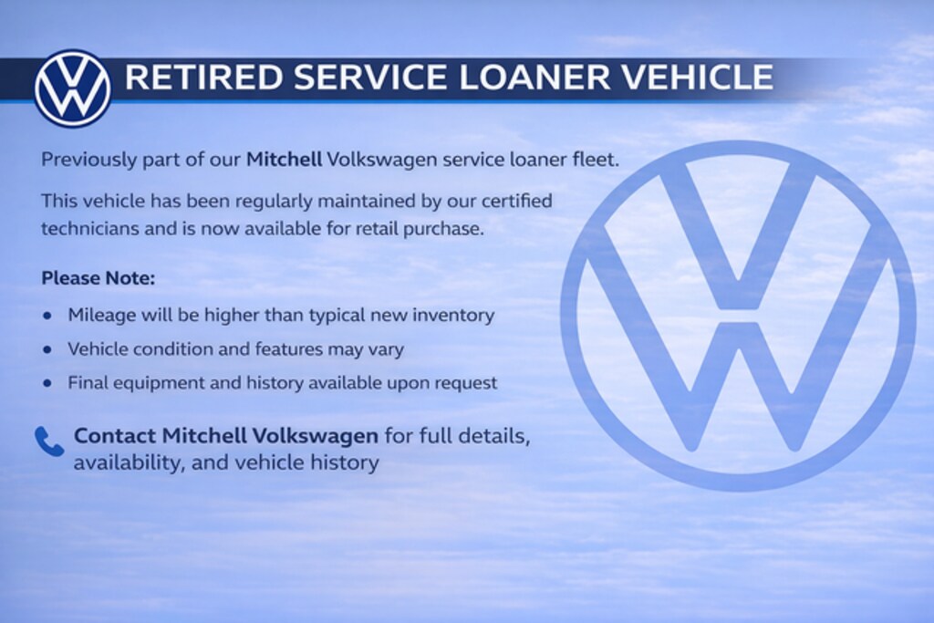 Retired Service Loaner Vehicle Disclaimer: This vehicle was previously used in our service loaner fleet and currently has approximately 5,471 miles. Vehicle condition, features, and mileage may vary from new inventory. Please contact Mitchell Volkswagen directly for full details, availability, and vehicle history.